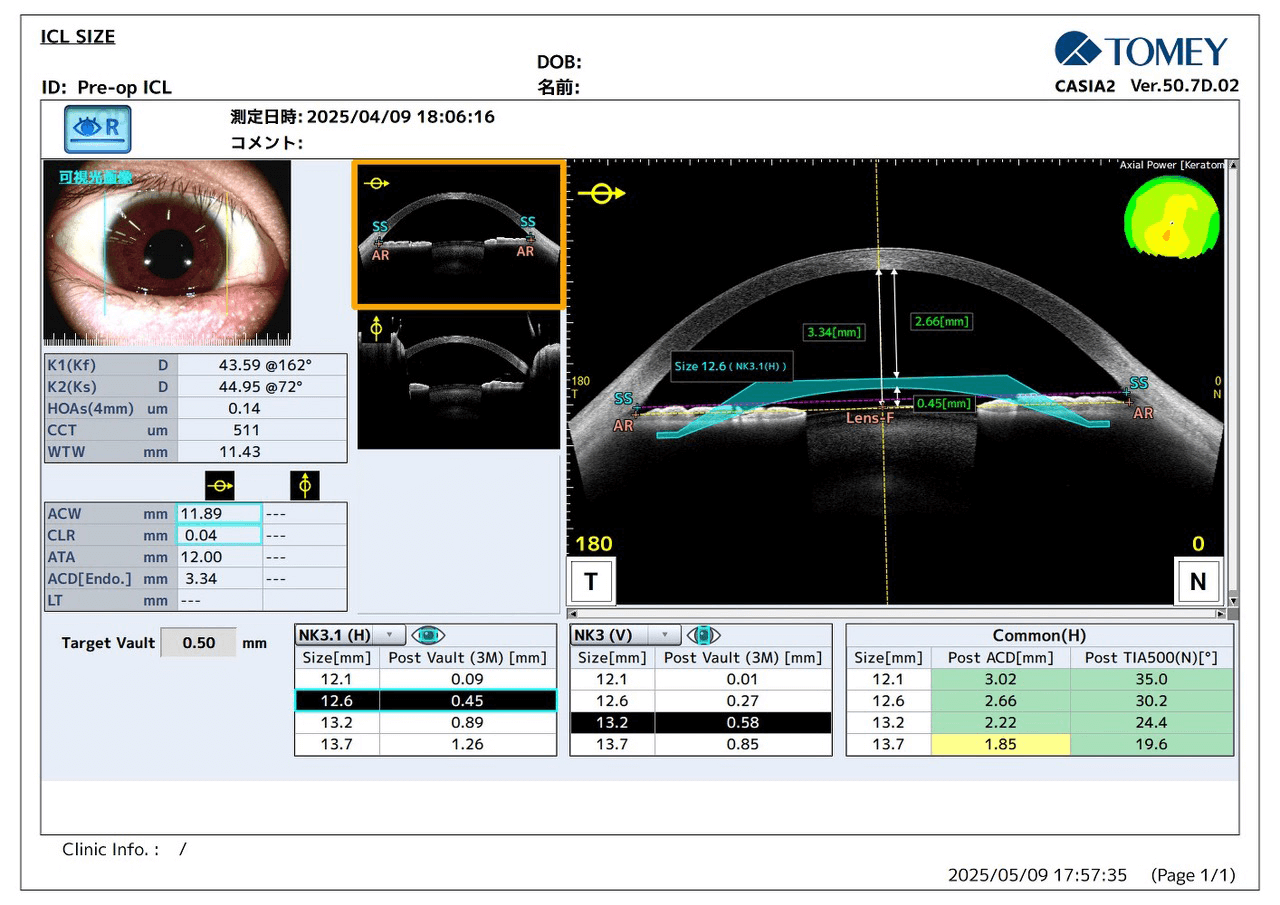 ICL手術では、眼の度数や前房の深さや白内障の有無などをもとに最適なレンズサイズを決定するため、検査の精度がとても重要です。